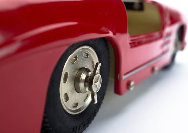 Vereinzelt finden sich aber auch äußerst feine Miniaturen aus deutscher Produktion wie das Modell von Tipp & Co./Tippco „mit Elektroantrieb und einer richtig funktionierenden Lenkradschaltung“, wie Matthias Braun schreibt. Dieses Spielzeugauto erweist sich nicht nur technisch seinem Vorbild angemessen, sondern es zeigt sich auch preislich dem luxuriösen Sportwagen angepasst: 23 DM muss man für den 300 SL von Tipp & Co./Tippco bezahlen, das ist Mitte der 1950er-Jahre sehr viel Geld für ein Spielzeug.