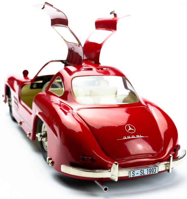 Aber die Faszination des Ursprünglichen bleibt, wenn man ein Blechauto mit Aufziehmotor in die Hand nimmt – diese Spielzeuge sind technische Zeitzeugen jener Epoche, die der 300 SL als erster Serien-Sportwagen seiner Familie geprägt hat. In den 1990er-Jahren bringt Märklin denn auch mit eben dieser Technik ein prachtvolles Großmodell des W 198 I heraus, das unter anderem als Sonderedition zum 40. Geburtstag des Landes Baden-Württemberg (silbern) und als Museumsmodell (rot) aufgelegt wird.